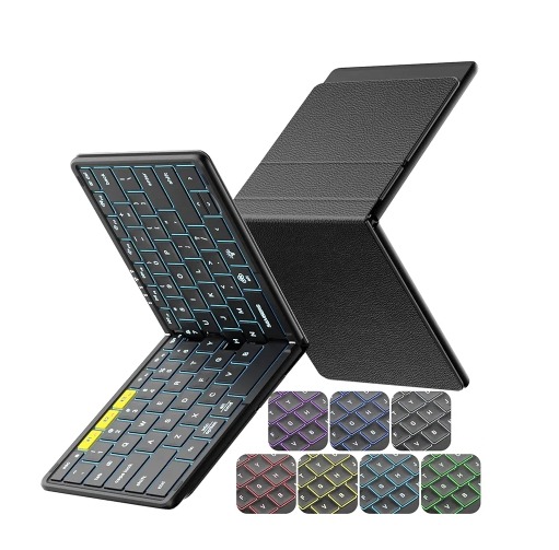 And now – I splashed out and bought a “Samsers” fold-in-half (full size keys) travel keyboad which supports up to 3 phones/tablets and swaps at the touch of a button. Despite being rechargeable-battery powered, the keyboard has full RGB backlighting, Lovely. Note: Can’t take a shot with my phone as I’m using the phone to type this hence the stock photo from Amazon.com website.