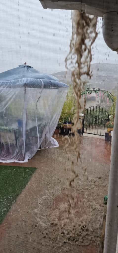 Both cameras are sitting outside right now, perched on our above-ground pool here in normal-sunny Spain, one facing in toward the house, the other facing the valley and distant mountains – and are they getting a beating? Yes. One has had a solar panel attached for a couple of days (mainly in the rain with little sign of any sun), the other got a quick solar charge before the heavens opened. So instead of the usual posed ideal photos…..