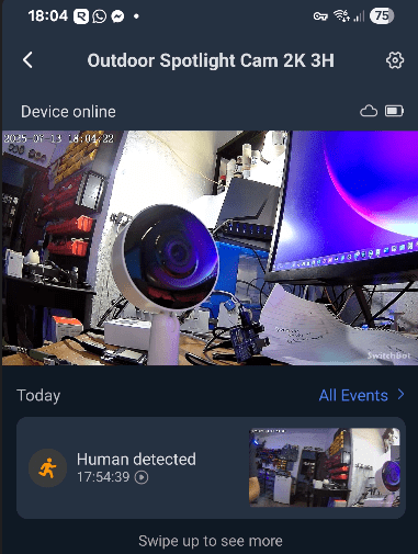 OK I changed my mind. For reasons beyond me the camera has not yet appeared in Home Assistant and it’s not going to – it does not support RTSP – so that’s a dead end – HOWEVER, back in June when I did the update with the one camera that Switchbot sent me second time around, I put it on charge (full charge) when I first got it then had it sitting around on my desk most of time (always turned on) where it is now – and I’ve STILL not connected it to power after that first charge.
