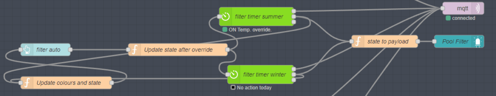 And now that’s working, a couple of node-red-contrib-bigtimers should do the job of keeping it running all year round. I should really add month settings for the second timer option but the more I add, the clumsier the interface becomes – so a pair of N-R-C-Bigtimers it is – simple timing with manual override via the phone to keep my wift happy.