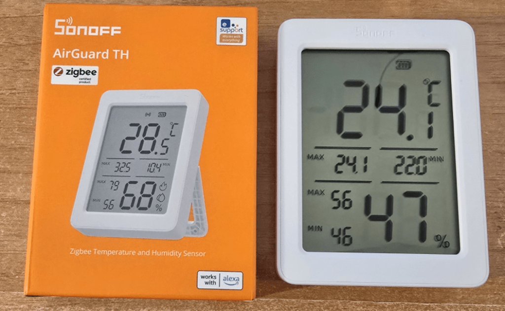 This should be an easy one- the new sonoff AirGuard TH is a desktop LCD Temperature and Humidity Sensor – decent size – showing maximum and minimum values as well as current values.