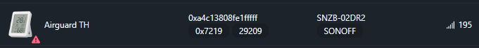 Not 100% sure about that red exclamation mark below Airguard TH (my name). But voltage, battery percentage, temperature and humidity are all exposed along with settings for degrees C versus degrees F etc.
