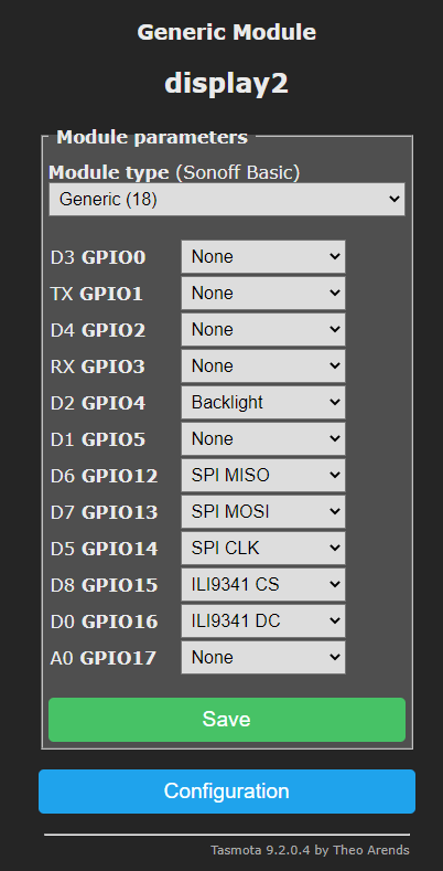 As soon as this lot ends up in tasmota-display.bin the ILI9341 wiring to achieve all this will be: