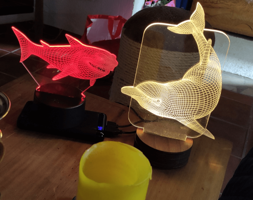 Another great gadget – see photo below: You’ll see a white dolphin I picked up at a seaside market in Spain early summer 2020 – they are widely available – they come with a wooden base + USB lead and have a bright, warm, single-colour (white) display – but the SHARK came from Banggood (described as “”), has a solid-looking black plastic base, USB lead and has full RGB including touch button options for any single colour or slowly cycling through the colours. I love it and so does my wife. The shark base in the photo above is sitting on a USB battery power pack I happened to have handy.
