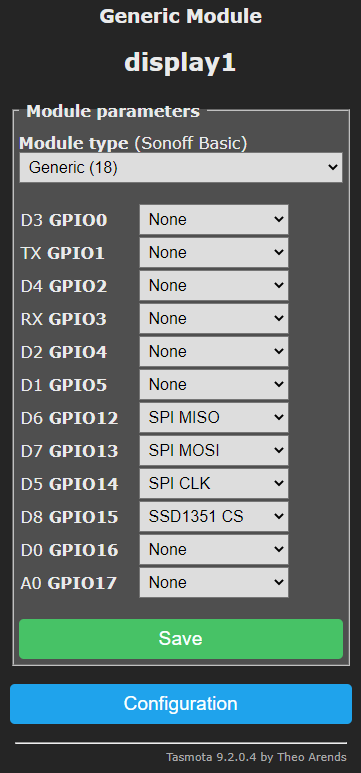 The setup for the display wasn’t QUITE as indicated on the Tasmota site – it seems that displays are not yet a high priority there, but with help I managed to get it running – here’s the template for Tasmota-display standard build – no need to compile a special. Note that the display does NOT have a CS pin but this has to be defined in Tasmota for the display to be recognised. I hooked RESET to RST and the backlight to pin marked BLK on the display. It SEEMS that Tasmota display support is a bit primitive as yet.