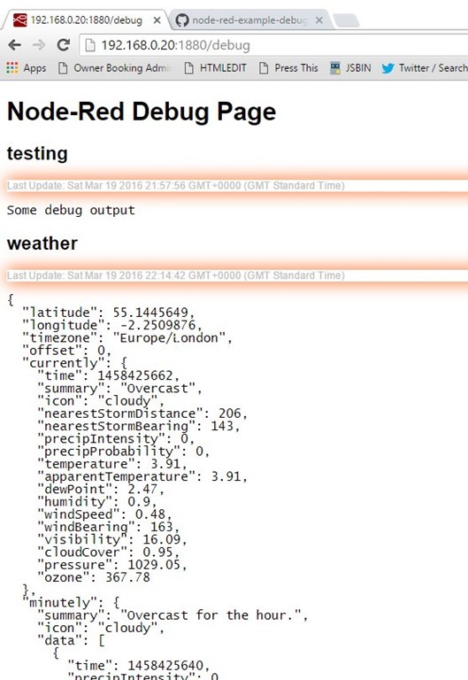 And it was with that in mind, when mindlessly trawling the web that I stumbled on a reference to a debugging FLOW for Node-Red which would treat text as text and would format JSON – but more’s the point – in a separate browser window – THAT caught my attention.