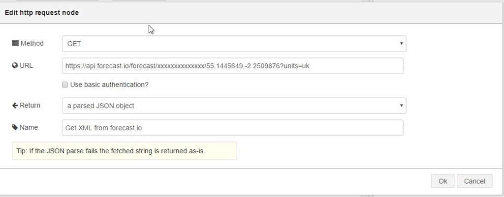 The timestamp just triggers an action every 5 minutes and at power up – sensibly every 15 minutes is actually enough. Then there is the grabbing of data from forecast.io where xxxx is your API key – freely supplied – and note I output as a “parsed JSON object”.