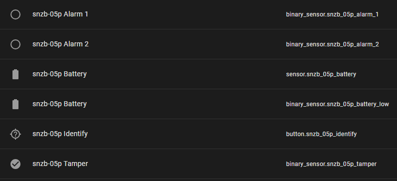 When I checked my Home Assistant devices list, the SNZB-05P has magically appeared with an “automatically generated definition”. Again in Home Assistant, under “entities” it looks like everything is in there – see image below….