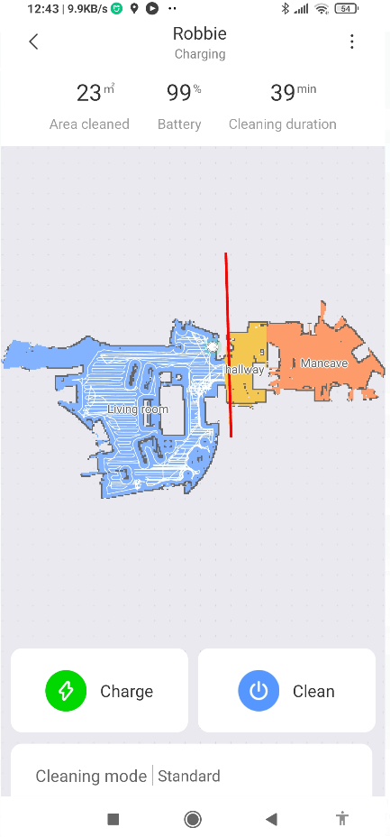 If I were to simply select the living room, I’d hear “Starting targetted room cleaning..” – right – (orange) hallway only. If I query where Robbie is, a happy voice says “I’m here” – reminiscent of my wife responding “it’ll be where you left it” when I ask where something is 🙂