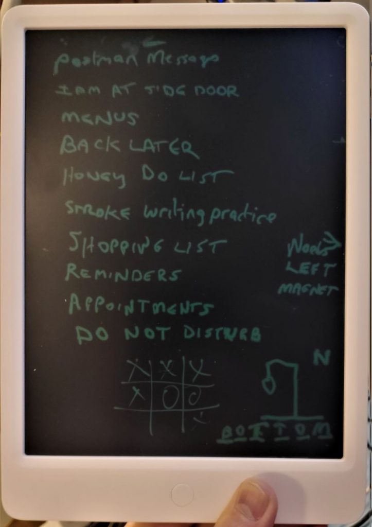 And so the point? This is all I could think of at the time, I’ve since thought of lots more used but here are the ones in the photo (minus the “hangman”). Messages for the postman and other deliveries (I’m thinking a couple of very THIN magnets for the door and tablet), menus, todo lists, shopping lists, reminders, appointments and for me as someone going (successfully) through the long term aftermath of a stroke (and as a computer user who is alwys running out of screen space for notes even though I have two large screens) – regular writing practice. I also have a memory like a sieve – and scribbling on my phone in the car on bumpy country roads (as a passenger) is a non-starter – every time we leave the house to go shopping, my wife tells me something I have to remember when we get back (and I rarely do).