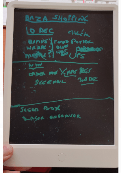 I touched the button on the right side to protect the screen (which never “turns off”) from erasure, while letting me continue to write with the included battery-free pen. This morning, after sliding the side switch to allow erasure, I used the button near bottom centre to instantly wipe the lot but not before taking a photo with my phone at 6am again with rubbish lighting.