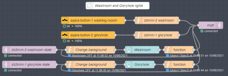 If you look at the code below, you could be forgiven for asking why the delay nodes – well, all I can say is without them I was getting unreliability in state control. It could also be that I cloned the gloryhole node to the washroom without resetting node-Red – that’s been known to cause problems in the past. Anyway, here goes…