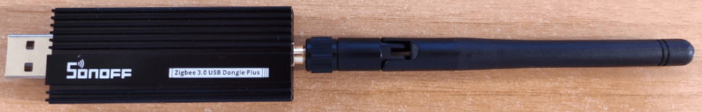 Power consumption of the new Itead (Sonoff) unit is 100ma max at 5v (USB). In keeping with the name on the website, the dongle itself is marked (on the back) as ZBDongle-P and on the front as Zigbee 3.0 USB Dongle Plus – and comes with a detachable antenna. I use this with Zigbee2MQTT on Raspberry Pi 4.